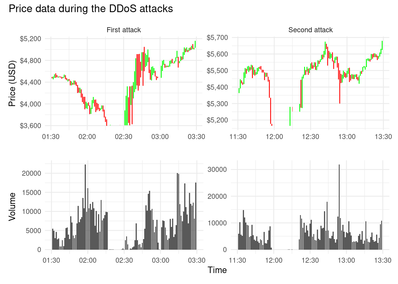 The effect of each DDoS is clearly visible from the price data, leaving large gaps for approximately 15 minutes where very few to no trades were placed. Immediately following each attack was a period of extreme volatility, before price was able to stabilise to some degree.
